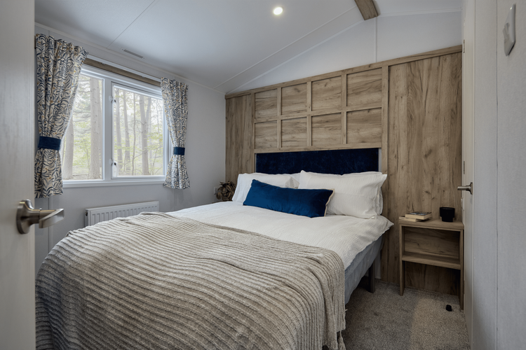 The master bedroom offers a calm and comfortable place to recharge. A cosy double bed sits against a panelled feature headboard, complemented by soft textures and modern tones.